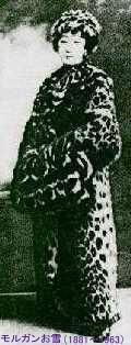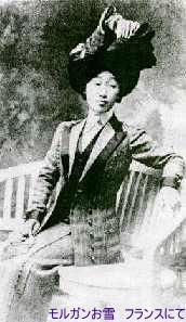 | (注)モルガンお雪 1881〜1963 (明治14〜昭和38) 本名加藤ユキ。 京都生まれ。 祇園の芸妓時代にアメリカの大富豪、 モルガン商会の御曹司ジョージ・デニソン・モルガンと知り合い結婚。 4万円の落籍金という事でも評判になる。 アメリカへ渡るがモルガン一族に拒絶されフランスに移り住む。 |