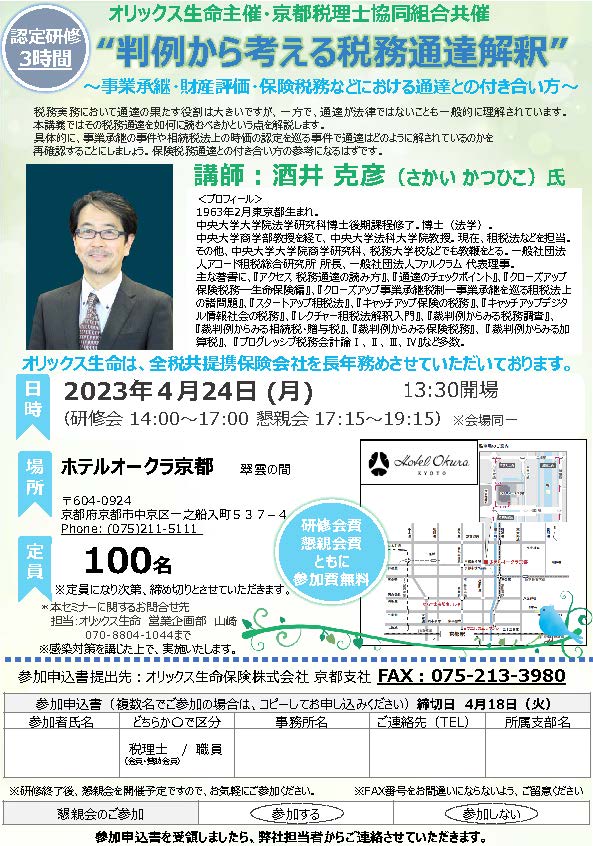 引き続き受付中です。申し込みにつきましては、オリックス生命 京都支社様へ